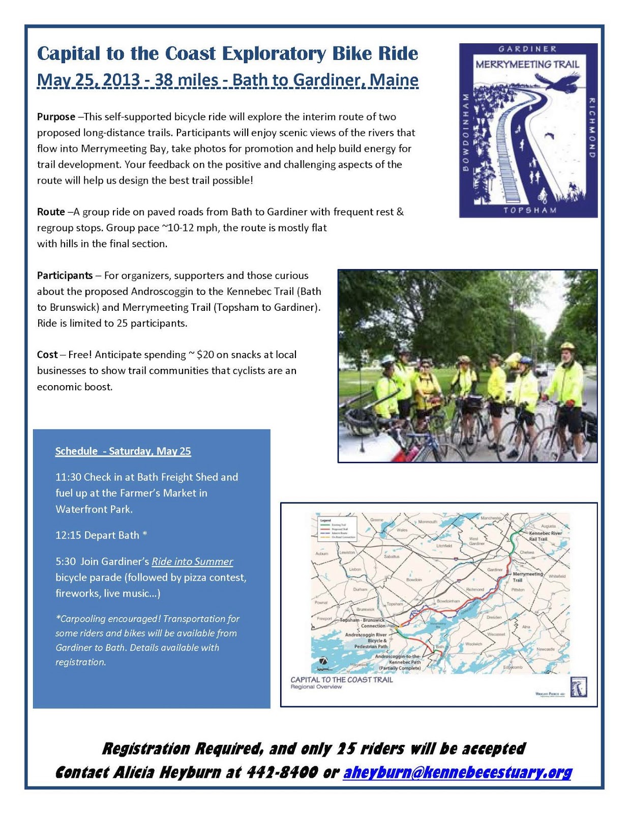 For organizers, supporters and those curious about the proposed Androscoggin to the Kennebec Trail (Bath to Brunswick) and Merrymeeting Trail (Topsham to Gardiner). Ride is limited to 25 participants.Cost: